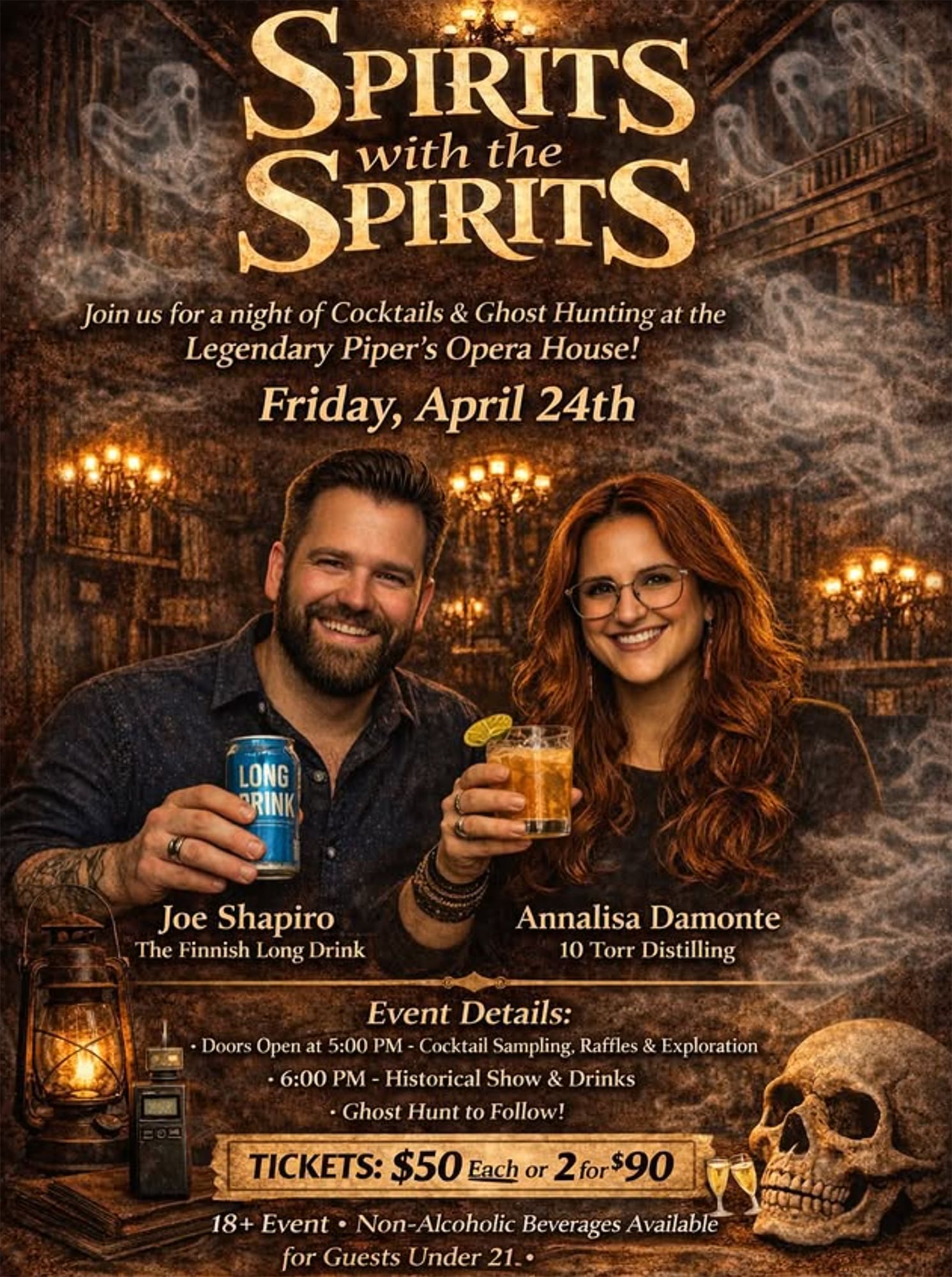 Join Joe Shapiro of The Finnish Long Drink and Annalisa Damonte of 10 Torr Distilling & Brewing for an unforgettable evening of craft cocktail sampling, a historical show, raffles, and a real ghost hunt inside one of Nevada’s most legendary haunted buildings.